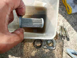 洗浄方法は灯油でジャブジャブして洗います(右写真)。左写真はこし器(金網状の物)を抜いた後です。この時残っていたクラッチオイルが出てきますので受けが必要です。こし器は結構汚れていました。そのあとこし器部分とバネを入れ蓋をしてネジで留めます。上からオイル(CD級#30=シングルグレード)を注入して検量棒で確認して終わりです。 | ![]() |