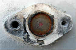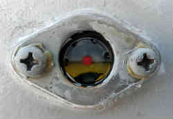 オイル確認用覗き窓の交換:右写真見ての通り従来からあった古い物はほとんどオイルが見えていません。窓(中央部の丸)のみ新しく取り寄せ交換しました。2本のネジを外し(かなり固かったので#3の貫通ドライバーをレンチで挟み使用)、プレート板も外し、中にこびりついていたシール剤を丁寧に剥がします。新しい窓にシール剤を塗布し元通りに組み上げました。中央の赤い点の箇所に黄色いオイルがあるのがわかります。 | ![]() |