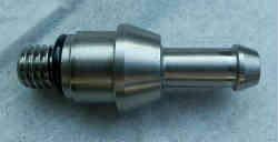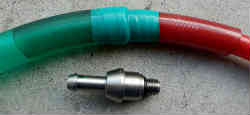 左はヤンマードライブSZ−111−1Tの排油ポンプジョイントです。M10のP1.5なので水道やエアー関係で貫通してねじ切ってある物が見つかれば格安で手に入れることが可能です。右は上記ホースを繋いでビニールテープ(青色)で巻いたものです。ちょうど上手い具合にキチキチのホースが見つかり潤滑剤を振って挿入しています。 | ![]() |