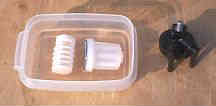 | 掃除は簡単で適当な容器(写真はタッパーであるができればガソリンが溶けない容器が良い)にガソリンを入れ中のゴミを洗うだけである。 | ![]() |