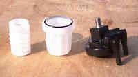 | 右写真はガソリンの吸い出し口を分解した物です。白い筒の底にはやはりフィルターでネット上みたいな物が張られていました。このタンクとエンジンには合計3カ所の異物を侵入させないフィルターがあるということです。ここももし汚れていたら掃除をします。 | ![]() |