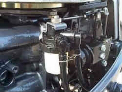 右が25馬力エンジンのフィルターです。大きなエンジンになるほどフィルターがしっかりした大きな物が取り付けられています。低馬力のエンジンにも一応ありますが、目が粗くとてもフィルターとは言えない物もありますのでできれば自分でフイルターを新設するのも良いでしょう。 右写真では上のナットをはずし、ガソリンの入力と出力の2本のホースをはずします。 | ![]() |