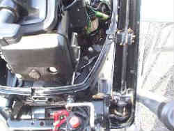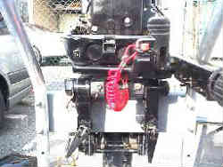 - エンジンの左右に舵を取る操舵(スロットル)バーには固さを調整するネジがシャフトの上の方(エンジンのヘッド下の片側)にあります。右写真ほぼ中央のネジ(六角ボルト)です。ここを右に回すと固くなり、左に回すと柔らかく(軽く)なります。