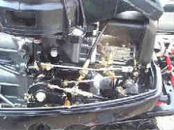 - 右写真では外の大きなネジの部分として、エンジンをトランサムへ固定させるためのネジや、その他特にエンジン外部の必要な箇所につきましてはたっぷりと塗って下さい。