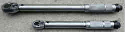 上記締め付けは経験や勘も大事ですが、正確にはトルクレンチという特殊な器具を使うことが必要です。ネジは緩すぎると緩んできて脱落します。きつすぎるとネジが折れます。私は2種類のトルクレンチ(それぞれ3500円程度)を使い分けます。長い方は最大105N−mで車のタイヤのホイールナットを締め付ける時に使います(車種により値が違うのでその車に合ったレンチが必要)。短い方は10〜50N−m用で一般的なボルト(ネジ)を締め付けるのに使います。レンチを規定のトルクにセットし(柄の部分を回してセット/左写真)、ソケットを装着し右回し(一般的なネジはすべて右で締め付ける(例外は扇風機やペラの一部)とカチと音が鳴りそれ以上は締め付ける必要がなくなります。これで締め付け完了です。 | ![]() |