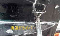 ネジをはずす: マイナスドライバーでネジをゆるめますが、固ければ貫通ドライバーの軸の角部分にプライヤーをあてがって回すと簡単に回ります。それでも回らないときはCRC−556の潤滑剤をスプレーしてしばらく様子を見てトライして下さい。それでも回らないときはショクドライバー(この時はエンジンをタオル等を敷いた上に寝かせて下さい)でたたくとか、マイナスドライバーの溝の端を小さなマイナスドライバーで少しづつたたいて(回す角度を考えて)見て下さい。 | ![]() |