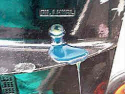 オイルのレベル確認: オイルを入れ終わると右写真のように上の穴からオイルがこぼれてきます。ここまで入ったなら上のネジを締めて(下穴にはオイルを突っ込んだまま)から、次に素早く下の穴のノズルを抜きネジを締めます。もし万一少量のオイルがこぼれて少なくなったと思う場合は、再び上のネジを開いて上からオイルを注いで下さい。 | ![]() |