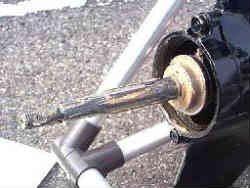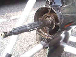 - 上記関連パーツをはずした軸です。ここの奥(写真では右側)によく道糸などが絡みついている場合がありますので、あればすべて取り除きます。この奥にはギヤオイルが入っている部分とのシールドがありますので、オイルが漏れていないかチェックして下さい。もし漏れておればギヤオイルが白濁していますのでギヤオイル交換の時にもわかります。