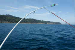 久々の釣行となりました。今日はフラッと出かける予定でしたが、テッポーするならナンチャンが乗せてくれと言うことで同行願った。この時期待望のサワラ狙いです。マリーナの情報では釣れ出しているみたいなので期待がもてます。釣友のタカラさんも同じ狙いです。ポイントへ着き引っ張ります。しかしあちこちポイントを変えても釣れません。今日は午後からマゼが吹く予報ですので昼までの勝負です。途中タカラさんに電話すると何と3匹釣れているとのことで、合流しますが我々は釣れません。何故かと言うとあとであとで原因がわかりました。知ってはいましたが仕掛けが違うのです。タカラさんはエバ仕掛けを使っているのです。喰いが悪いときは差が出るそうです。曲がった釣り針に鳥の毛みたいな物を付けたヤツです。上陸後詳しく説明を聞きサンプルも頂きました。これで仕掛けを作る予定です。糸の間やハリスの長さも違っていました。喰い気があるときはテッポー仕掛けでも同じらしいです。昼過ぎにサワラを諦めポイントを大きく変え青物狙いへと転進します。 周りは風が吹いてきたため誰もいません。まあ帰りは追い風なのであまり気にしていません。すると1時頃から竿先に反応があり引き上げるとハマチが付いています。気をよくしてさらに引っ張るとグングンしなっています。上げるとサバが付いています。そしてまだ付いています。そしてまだ付いています。計ツバス1匹とサバ4匹でした。そして再び流すとまたもや同じ感じで付いています。最後の最後で逆転ホームランと言った感じでお土産ができました。やっとこれから私の釣りシーズン開幕と言った感じです。軽油の免税券が切れたのでさっそく来週早々にも申請に行ってきます。帰りは追い波のサーフィンを楽しんで?帰ってきました。ナンチャンは怖かったそうです。釣果は二人でハマチ×2・ツバス×1・真サバ×9でした。自作のテッポー竿もうまく機能しています。 |