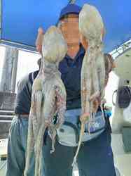 2016年6月9日(木)中潮:明石方面:天気(くもり時々雨):釣果真ダコ×19 今回は平日にGLGさんを誘っての釣行です。今が旬の明石の真ダコ釣りです。時合いに合わせて早めのスタートです。前艇よりかスピードが落ちたのでゆっくっりと時間をかけポイントへ着きます。竿はタコ専用のソルパラ(オクトパス)で単なる棒きれみたないな安物の竿ではなく、穂先が曲がる感度の良い物でしかも胴はしっかりしているものです。タコテンヤは自作の4本針でタコエギを付けられるように尻尾(ピアノ線)をつけているのが特徴です。エサは疑似餌の「タコの恋人」というものです。ピアノ線を通し尻尾がヒラヒラ浮き上がるように留めています。そして私は禁断の2本竿です。1本はスターンに置き竿で大型電動リールを付けています。手持ちは中型の電動リールです。それぞれタコ用にと5号程度のPE糸を50mほど継いでいます。そして尻尾には派手なタコエギ(フィッシングエイトの特価で10個ほどまとめて購入)を付けています。そしてポツポツとタコが上がりますが、GLGさんは不調です。今シーズン初めてなので勘が戻ってきません。どうも海底の抵抗とタコのアタリの区別が付いていないようで何度も合わせを入れ巻き上げています。時間のロスです。途中GLGさんが根掛かりで仕掛けをロストしてしまい、同時に私にも根掛かりでどうしても底から外れません。船を元に戻し何とか外そうと試みます。根掛かりの時元に戻し緩めてから引っ張ると外れることが多いのです。何回か試みると外れました。急いで電動リールで巻き上げると抵抗があります。そうです大きなタコが掛かっていました。根掛かりではなく大型タコがへばりついていたのです。手持ちの竿を操作しながら視線は置き竿の方にも行ってます。グウと押さえ込まれると素早く手持ちを置き、ラーク竿受けから外し穂先を下ろして慎重に糸ふけをとりエイヤと合わせて巻き上げます。すると大きなタコが乗ってきます。置き竿にアタリは少ないですが大きなタコが乗るように感じます。おおよそ手持ち4に対して置き竿1の割合でしょうか?。潮の流れが速いとアチコチポイントを変えながら釣っていきましたが、昼からはアタリゼロになったので納竿とします。結果私19匹に対しGLGさんは4匹のみとなりました。写真はマリーナで撮ってもらいブログに載せてもらいました(顔はボカシを入れています)。 |