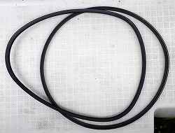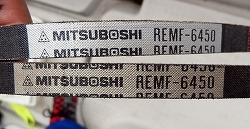 外して新旧比較したベルトです。やや三角状になっているのが古い物で(品番写真では上が新品、下が旧品)、丸い物が新しい物です。輪をかぶせ長さを比較するとやはり古い方が伸びており外周が長くなっています。当然ベルトは同じ品番の物を用意しなければなりません。少しでも規格が違うとベルトの破損に繋がり最悪ベルトが切れて大変な事になります。 純正品は1個約1000円 |