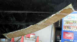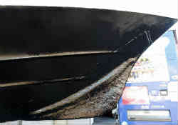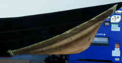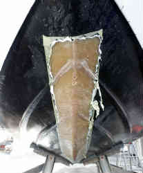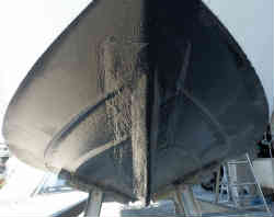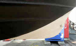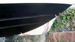 マリーナに置いてある他船の物を見て参考にします。バウ側のみとセンターキールまで続いている物もありますが、大がかりになるのは避けたいためバウ側のみとします。最初はダンボールで船底のカーブの型紙をとります。増設部の形状は長さ含め色々なパターンを想定しながらベストな物をデザインします(結局は板の大きさで決まりました)。そしてカッターで切り抜きます。やはり底のキール部のカーブのフィットが一番難しいです。切り取った増設キール部を船底にテープで貼り付け感じを見ます。 | ![]() |