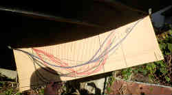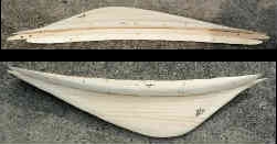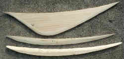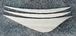 次にこの型を用い電動ジグソーで板(910×250×18厚ミリ)を切り抜きます。この板だけでは接着の際の船底との強度不足が考えられるため、船底部分に2枚の弓形の板(1×4材)を両サイドから補強するためこれも適当に目分量で切り抜きます。中心板と船底に前後二箇所の穴を少し開けネジで仮留めしてみます。ここまでおおよそ3時間かかり板代は計約1300円でした。実際に浮いている場合と滑走している場合の波の位置も確認済みです。 | ![]() |