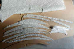 FRP用素材はネット通販(北海道)で購入しました。木材にFRP素材を貼り付け易くするための下地塗料としてプライマー樹脂1kg・不飽和ポリエステル樹脂(ノンパラタイプ) 2kg・硬化剤50g・ガラスマット1040ミリ幅×長さ2m・洗浄用アセトン500ミリリットルのセットが約4200円(消費税・送料込み)です。最後に塗るトップコート黒色は以前に船底を塗った物が余っていますのでそれを使います。 中央の板と左右サンドイッチの補強板との段差の隙間を埋め有るため、ガラスマットを何重も貼っていくのでそのため形状に合わせてカットします。マットはチクチクするので手袋をした方が良いでしょう。また細かな繊維が服にも付きますので作業着(つなぎ)を着用した方が良いです。 | ![]() |