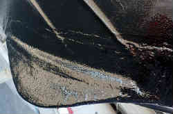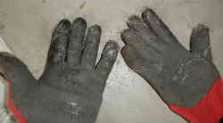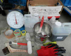 右写真はFRP積層の材料(ガラスマットは写っていません)と道具です。左写真はマットのカス(繊維)が作業用手袋に付いてなかなか取れない状態です。ガムテープで貼ると取れやすいです。スポイドはメモリ付きの10cc用の物を用意しました(以前の船底塗料時の物)。基本は常温(15度〜20度)では樹脂やプライマー・トップコートは1%の配合です。1kgで10ccの硬化剤の配合です。気温が低くなると2%まで増えます。また5度以下と30度以上は作業不適です。また湿気にも注意を払い(雨はもちろん結露にも注意)、あげくは直射日光を避けなければなりません。屋外ではなかなか難しい条件です。 | ![]() |