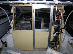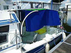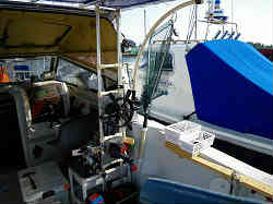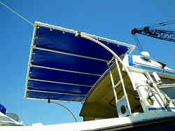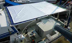 メインオーニング: オーニング(雨・日除けテント)は、昔製作してきた技術を応用して、アルミパイプとイレクターを使って組み立てました。デッキのスターン側まで全部を覆うというのも考えましたが、竿を扱いやすくほとんど多人数で釣ることもないので、運転席後部のおおよそ半分程度覆うように設計しました。テントはテント製作会社に生地の選定を任せ、こちらの寸法通りに製作して頂きました。 | ![]() |