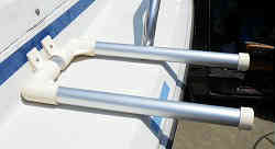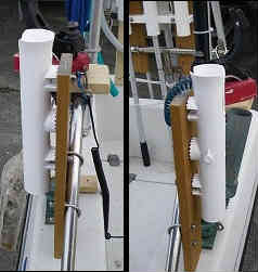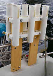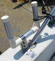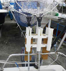 竿立て6本用: 竿立ては以前と同じような作りで、腐らない人工板に穴を開け、3連ロッドホルダー2個を裏同士合わせて固定します。それを丸パイプにて3箇所ステンレスのU字フックで固定しています。一番邪魔にならないようにスターンの右後ろにセットしています。 | ![]() |