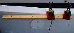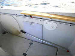 サブ竿立て1本用: 釣り座の横にちょういと立てかけられる垂直の竿掛けを設置しました。竿を替えたりやちょっと置いておくのに便利なようにとしました。ゲストにも同じ物が設置しました。レールにU字クランプで留めています。板は中にアルミが入った腐らない合成樹脂です。 | ![]() |