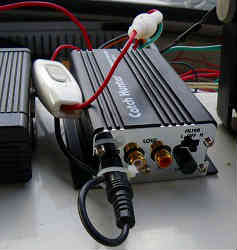 音楽用パワーアンプ: クルージング時や釣行中は音楽を聴きながら行いたいものです。メモリーウークマンとアンプをミニジャックで25+25=計50W出力のパワーアンプに繋ぎます。アンプには小さなスイッチを付けています。赤い線(+)にはヒューズホルダーが見えています。アンプはボリュームを調節できるノブが付いています。下のスピーカーとセットで約1万円でした。 | ![]() |