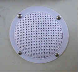 音楽用スピーカー:上記アンプよりスピーカーコードを繋げます。スピーカーの設置は右はちょうどうまく以前のシングルレバータイプのリモコンの穴がそのまま活用できました。穴を塞ぐ役目も担っています。また左は新たに直径10cmの穴をサークルカッターで開け取り付けしています。 スピーカーは防水仕様です。 | ![]() |