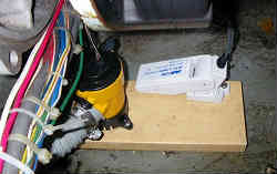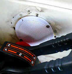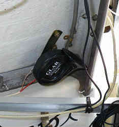 オートビルジポンプ:ドライブ艇はエンジンルームの船底に海水をくみ上げてエンジンを冷却する装置があります。もし万一そのくみ上げているホースが破裂したり、何らかの理由で海水が漏れて入ってくるのに気がつかなければ沈没する危険性があります。普段は陸上においてあるので問題ありませんが、エンジン稼働中には音がうるさくて気がつきにくいものです。そこでビルジポンプとオートフロートスイッチを設置しました。特筆なのは2つあり、ひとつは手動スイッチでもポンプを稼働させることができるように別回路を増設した事と、ふたつめは同じ電気回路にホーン(自動車用で2個1セット900円)を取り付けました。海水が貯まるとホーンがなり(と同時にビルジポンプが稼働する)ますが、うるさいので手動でブザーのみ切ること(別回路)ができます。ホーンは低音と高音の2種ありましたが、他の警告音(高音)と分けられるようにとわざと低音を選択しました。エンジンルーム横のカンコ(物入れ)には別途手動のみのビルジポンプが2個あり、最大3個のポンプを同時に稼働させることができます。 | ![]() |