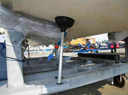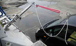 | 右写真はクレーンの4本のベルトに載っかているボートで、上記ベルト固定器の間に緑色のベルトが挟まる。 | ![]() |