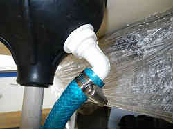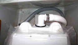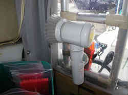 電動トイレ設置3:配管です。船の外側(海水)と繋がっている古い配管はそのままにしてホースを切り取り除き新しいホースを繋ぎます。なお排水側は太さが全然違うので途中付属のアダプターを利用し細くしています。このトイレは一般的なTMC社の物で、入水と排水がほとんど同じ太さです。左側写真では奥のホースが排水用で、隠れているホースが入水用です。入水用から汲み上げた海水はその右にある白いホースに繋がっており、それが上に伸びて便器の上から出ます。その水は汚物と一緒に撹拌切断されておくの透明のホースから出て行きます。透明なので汚物が見えると不快かも知れませんが(流している時は前を向いているので見えない?)、詰まりや水の状態を確認するのに良いかも? | ![]() |