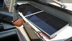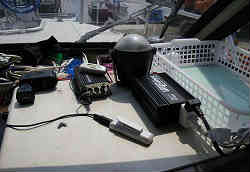 GPS魚探(釣行席用): 運転席にもGPSはありますが、やはり釣行席にも必要です。以前のヤマハロイヤル製の物をサブステーションの左横に取り付けました。見やすくて邪魔にならない所はもうここしかありません。上下の支柱の1本にまたがってできるだけ外にはみ出さないようにと付けてみました。パイプジョイント金具を使いワンタッチ脱着架台Mを使って設置できます。またぐらつくので下部にも金具を使って支えています。 | ![]() |