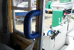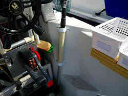 タモ立て運転席用:下記タモはゲスト用ですが、自分専用のタモ立てが要ります。タモはやはり常に自分の左にいつでも出せるように立てかけておきたいものです。よってもうここしかありませんが筒を固定して作りました。キャビンの前には行きにくいですが、行く場合は反対側の左側より前に行きます。筒は若干海に突き出すような角度を付けています。 | ![]() |