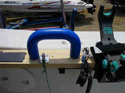 タモ・ヒシャク立て: スターン側竿受けの反対側に同じように6本立てかけられる物を作りました。タモ大3本と小1本それにデッキブラシを設置しました。ロッドも立てかけられます。 | ![]() |