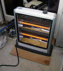 コクピット内暖房ヒーター: DC12V用のヒーターはやはり暖房能力ではかなり落ちます。安くて暖かいAC100V用のヒーターを設置しました。転倒防止にと底には別途板を取り付けています。電源はデッキに発電機(ホンダ4スト900W)を積み込み発電させ、それを引き込み穴(水道用のネジ蓋付き)からコードを引き込んで室内を暖めています。かなり暖かいです。現在では撤去しています | ![]() |