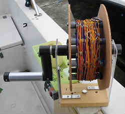 スパンカー正面と支柱中央部:左はスパンカーを正面に見たところで、左右の展開は同じにしていますが、その時の風と潮の流れに応じ開く角度が違ってきますが、おそらくそのような邪魔くさいことはしないと思います。 右は支柱を回転させるロープが出ているところ(中央の黒い筒状の物)で、この2本のロープを引っ張ることにより支柱が回転されます。当然支柱頂上の固定用3本のロープ部は回転できませんので、支柱部との接触部は回転します。 | ![]() |
