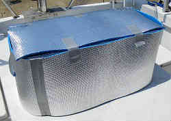 太陽光反射クーラーボックス: 最近の地球温暖化のせいで真夏の温度上昇は凄まじいものがあります。デッキ上のエンジンボックスの上に安物のクーラーボックスの大型を置いていますが、バラ氷(クーラー2杯200円)を入れておくと早く溶けます。春はそうでもなかったのですがやはり夏の直射日光が射すとすぐにクーラー内は気温上昇します。そこでキャンプの時に使う銀色のロールマットを切ってクーラーボックスに被せるように覆う事で気温上昇を防ぎます。クーラーボックスに直接アルミのテープを貼ると言う事も以前していましたが、洗ったりするとすぐにダメになります。これはクーラーボックスを洗う時は上から抜いてクーラー本体のみを洗います。現在では使用していません | ![]() |