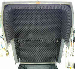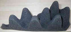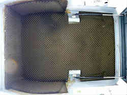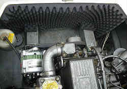 エンジンボックス内防音マット旧分:従来のエンジンボックス内は簡単な防音のスポンジ(厚み25ミリほど)が貼ってあるだけでした。しかも貼ってある箇所も簡単な物で、細かな部分は何も貼っていませんしもうボロボロです(少し触るとポロポロと落ちる)。。そこで古いスポンジを剥がし、新しく防音材を貼ってみようと思いました。右の写真は古い吸音マット。 | ![]() |