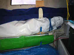スパンカーロープ固定部:左は頂上から前方へと伸びるロープでコクピットの天井にプレートフックを取り付け固定しています。 右は左右後方に伸びた固定用ロープでこれも頂上から伸びています。その隣に見える青いロープは左右に張りだしたアームパイプを固定する物です。これもプレートフックを固定しロープを接続しています。よって固定ロープは頂上より3本アームを固定するのに2本となっています。 | ![]() |