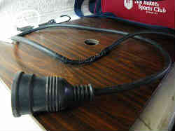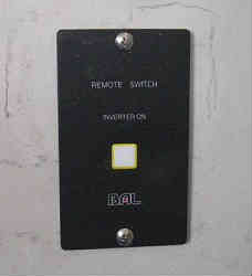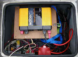 インバータ1800W: 船内で便利に家電製品が使えるようにとインバータを設置しました。これは調整矩形波(正弦波ではない)ですので、正確な波形が必要な電子機器等には使用できませんが、まあパソコンや電子コントロールするような物はありませんので大丈夫です。一応国産の大橋産業社製です。1800W(多くのコードは1500Wが規定なので)ありますので、普通の家電はおおかた使えます。当初ブースターケーブルの線を継ぎ足して本体をキャビン内に設置しましたが、コードの太さが細いのと長い距離のためだろうと思われますがエラーが出て失敗しました。よってバッテリーの近くに純正の短いコードを利用して設置し直しました。よって100Vコードを長く伸ばしキャビン内に引き込みます。コードはプラグの所が太いため途中切断し、穴に通してからまた繋ぎ直しています(大きな穴を開けるのが嫌なため)(下右写真)。またこれはリモコンが付いており(右写真)、離れた場所(キャビン内)からオン・オフができます。バッテリーボックス内には万一上から水がかかっても良いようにとプラスチックの箱を覆い被せています。これにてキャビン内のヒーターやヘヤードライヤー(霜取り用)などに使用できます。現在では撤去しています | ![]() |