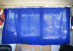 サイドカーテン: 釣行時太陽はなかなか真上から照りません。朝夕はどうしても斜めから日が差します。直射日光はとても暑いのです。そこで横にサンシェード(カーテン?)を作ってみました。少し視界が悪くなりますが、釣っているときだけで、長距離走るときは外し、少しの距離でしたら運転席からの運転で邪魔にはなりません。長さは2mで幅(垂れ長)50cm程度、ステンレス製のフックでワンタッチ脱着が出来ます。布を水道の塩ビパイプにボンドを塗り巻き付けて結束バンドで留めています。外せば2本クルクル巻いて収納します。 |