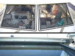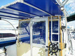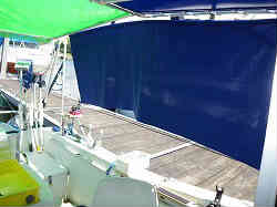 キャビン内カーテン:駐艇中キャビンの中が丸見えですと盗難の恐れがあります。そこでキャビン内にカーテンを付けてみました。カーテンレールはホームセンターで約700円・生地はヤフーのオークションで1.7m幅×40mでたったの525円(取りに行ったので送料も無料でこんなに要りませんが何かに使えるので)でした。あと生地を挟むキャッチャーを付けています。右側の写真は内側から、左の写真は外側から撮っています。 | ![]() |