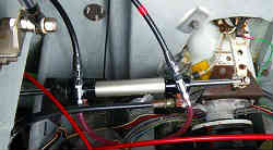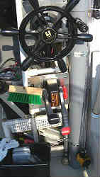 運転席内メインコントロール: 運転席のコントロールボックスはシングルレバーからツインレバー(サブコントロールボックスと同じ物)に換えました。設置方法は従来よりやや位置を下に下げて、曲がった木製の棚を支えるステーを2本使いアルミの板で固定しています。底から出ているワイヤー(ハーネス)のうち赤い色2本は従来からの物でエンジンへと繋がっており、青い物は後ろのサブステーションまで伸びています。 | ![]() |