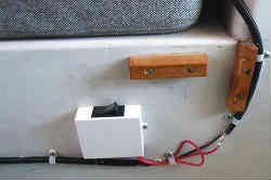 コクピット内小型扇風機×2: リアハッチ仕様にしたため、これから室内は暑くなりそうです。そこでクーラーの設置も一時は考えましたがどうしても無理です。そこで家庭用100Vの小型扇風機を左右に1個づつ取り付けました。電源は小さなインバータ(12V→100V)を使います。設置には天井に角材を渡し扇風機のクリップで留めているだけです。現在では撤去しています | ![]() |