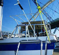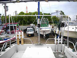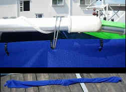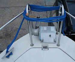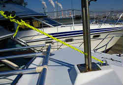 ドックライン(係留用もやいロープ):ドックラインを艇体色にあわせて青色を海外輸入で買いました。5/8インチ径でナイロンのロープです。長さ25ft(約7.5m)で前後にあります。先の一端は輪状になっており、クリートに通して絶対抜けないようにしています。もやいロープはデッキ上に置いておくと、ゴミがたまりデッキの色が黒く汚れますのでぶら下げておきます。バウ側はステンレス製のパイプレールに絡ませ、スターン側はカラビナの大きな物に引っかけます。これらは通常陸上保管している時だけ(大半がこの状態です)の状態です。 | ![]() |