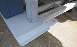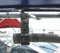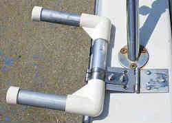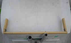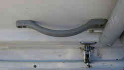 ボート上下架用ベルト固定器: 私の船は陸置きで普段は陸上に置いています。よって毎回マリーナのクレーンにて上下架させています。降ろす時はあまり問題はない(というか電話1本でマリーナの社長が降ろしていてくれる)ですが、帰港して揚げる時に船の決まった箇所にクレーンのベルトを固定させないといけません。理由は前後のバランスはもちろんですが、陸上に置いてある船台の前後の受けより外側にベルトを位置させ降ろさないといけなく、また船台上の前後バランス的にも船の位置が決まっています。私の船ではベルトは少し広がるように掛けなければいけないので二人でもなかなかうまくいきません。ある程度のテンションをかけて少しずらさないと決まった定位置へかけられません。そこで一人でも必ず決まった定位置でも掛けられるようにと考案してみました。ベルトの幅より少し広めの幅のコの字型の物(アルミパイプとイレクターで製作)を普段は上に挙げておけるようにし、ワンタッチで横へはみ出せる(倒す)ようにした装置です。写真の下左2枚はバウ側(キャビン前方横)の物で普段は上に挙げておき、ベルトを掛ける時には下に下げ(外側に突き出す)ます。また右2枚の写真はスターン側(デッキ)の物でこれもステンレスの蝶番を利用し上下できるようにして(上の時はゴムで引っかけ固定)います。ベルト4本に船をくぐらせてこの装置を外側に倒しながらコの字型枠に入れておきます。これでずれることなく一人でも簡単に固定され挙げる事が出来ます。現在では使用していません |