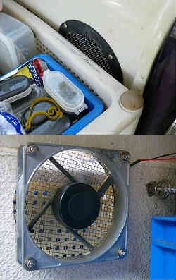 ソーラーパネル換気旧:ソーラーパネルで当初バッテリーの自然放電の補充電を考えていましたが、2バッテリーシステムにしたのと結構稼働させているので必要なく、代わりにキャビン内の換気として利用する事にしました。ソーラーパネル2枚をアルミのL字型ステー2本を使い両面テープで貼り2枚縦に繋げます。2枚繋げたのは電流量を2倍にするため(1枚だと曇りの時はファンが回らない)でこれで12V駆動ののファンが昼間太陽が当たっている時回ります。キャビンとコクピットに繋がる壁に丸い穴を開け表(外)側には虫除けの金網で覆い取り付けます。パネルはコクピットの屋根の上に設置も考えましたが、防水加工が邪魔くさくコクピット内のガラスの内側に置く事にしました。キャビン内には洗ったイスや釣り竿の水滴・雨漏り等結構湿気が貯まっています。これにて常時日中は換気ができ乾燥させる事が出来ます。 右写真は回転しているファンで上はキャビンの外側で下は内側。 ソーラーパネル換気新:リアハッチ仕様にしたのでコクピットが暑くなってきました。以前はキャビン内の換気が目的でしたが、今回はコクピット含めての換気でファンを移動させました。新しく作ったリアハッチの下方にです。邪魔にならず外へ空気を排出させます。これからは直射日光も強くなりましたので勢いよくファンが回っています。 | ![]() |