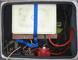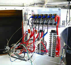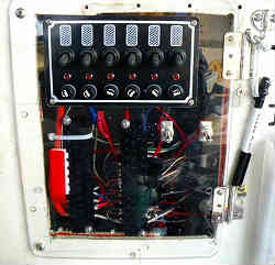 運転席横スイッチ:スイッチ類はかなり古くて正常に機能しない物もあったので、すべて配線しなおした。表差し舵に使うのポリカ板を蝶番で留め壁に設置した。蓋のように開け閉めができそこに6連のスイッチと2個の単独スイッチを配置した。裏側には配電盤をプラスとマイナスを付け、各電装機器から配電する。なお全てにヒューズを介している。透明なので見てくれは悪いが一目瞭然である。なお各コードにはタグで機器名を表記している。 | ![]() |