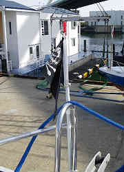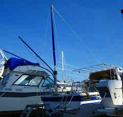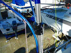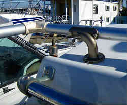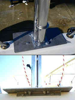 スパンカー基部: 基部は以前の物がありましたが、寸法的に合わないので取り外し新設しました。ヤフーのオークションで6ミリ厚のステン平板を購入し、穴を開けスターン外側にはL字の金具を少したたいて折り曲げボルトで留めています。穴の部分とボルトはシリコンでコーティングしています。その上にワイズギアの筒部をボルトで固定しています。 | ![]() |