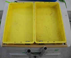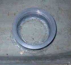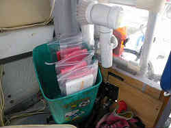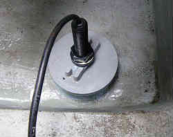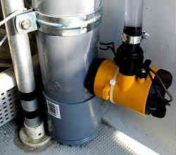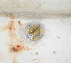 イケス内水抜き栓: イケス内には入排水用のスカッパー(栓)が左右にありますが、少し底より高い位置にあるため、海水が抜け切りません。そうするとどうしても湿気が貯まり中に入れてあるバケツや網などが黴びてきます。そこで底に小さいながらも栓を付けて完全に排水しきってしまう用にしました。 | ![]() |