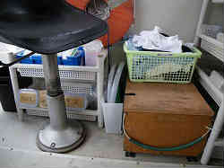 物入れカゴ1: キャビン内に通じるスライドドアーの左横に安価な脱衣カゴみたいな物を2個(1個2段で980円)縦に繋げて設置しました。ネジを1本貫通させ留めています。ここに仕掛けや小道具を収納します。現在では引き出し式のたくさん入る物に変更しています。 | ![]() |