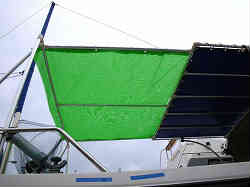 サブ(後方)オーニング:オーニング部 前方のオーニングのヒサシ部と上記支柱に渡した梁を3本のアルミパイプを引っかけ固定します。オーニング部はかなり迷いましたが(実際に作らないと風の抵抗等が判らないため)、結局工事用のメッシュ素材(緑色で半分畳めばピッタシの大きさが偶然あった/できれば青が希望だが無かった)を結束バンドで固定した。畳めば棒状になり、また雨天時でもその上にシートをかければ雨対策にもなる。 |