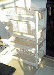 物入れカゴ2: コクピット内運転席の後ろとサブステーションの間に上記説明のカゴを1個(2段)を設置しました。その前には電動リールのコードや竿掛け座(パイプラーク改良型)を入れています。後ろにはゴミ箱・各種おもりや小物等を入れています。 | ![]() |