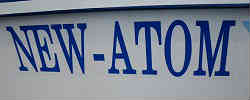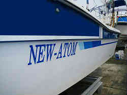 船名ステッカーの貼り付け:船名(NEW−ATOM)を「アイワ・デザイン工房」さん(←クリック)へ発注しました。同じネット販売でも他社の半額程度ではないかと思われます。15cm×60cmの大きさで、字体はゴシック体、色はロイヤルブルーでお願いしました。1枚1500円×2枚であと送料600円でした。貼り合わせの位置決めをして、油分を取り除くスプレーを施し汚れを取り除きます。マスキングテープで仮押さえをし、端から裏面の剥離紙を少しカットし中央から端へと空気を抜きながら指で押さえ貼っていきます。この時細心の注意を払って空気ができるだけ入らないように、少しづつ押さえながら貼っていきます。次に反対側の部分も同じように中央部分から端に向かって少しづつ貼っていきます。最後にしっかりと指で押さえつけて終了です。文字以外の部分は透明のシールです。左右同じ場所に貼り付けています。おまけで小さな船名シール(ミニチュア版)も頂きましたのでスターンのトランサムに貼り付けました。 | ![]() |